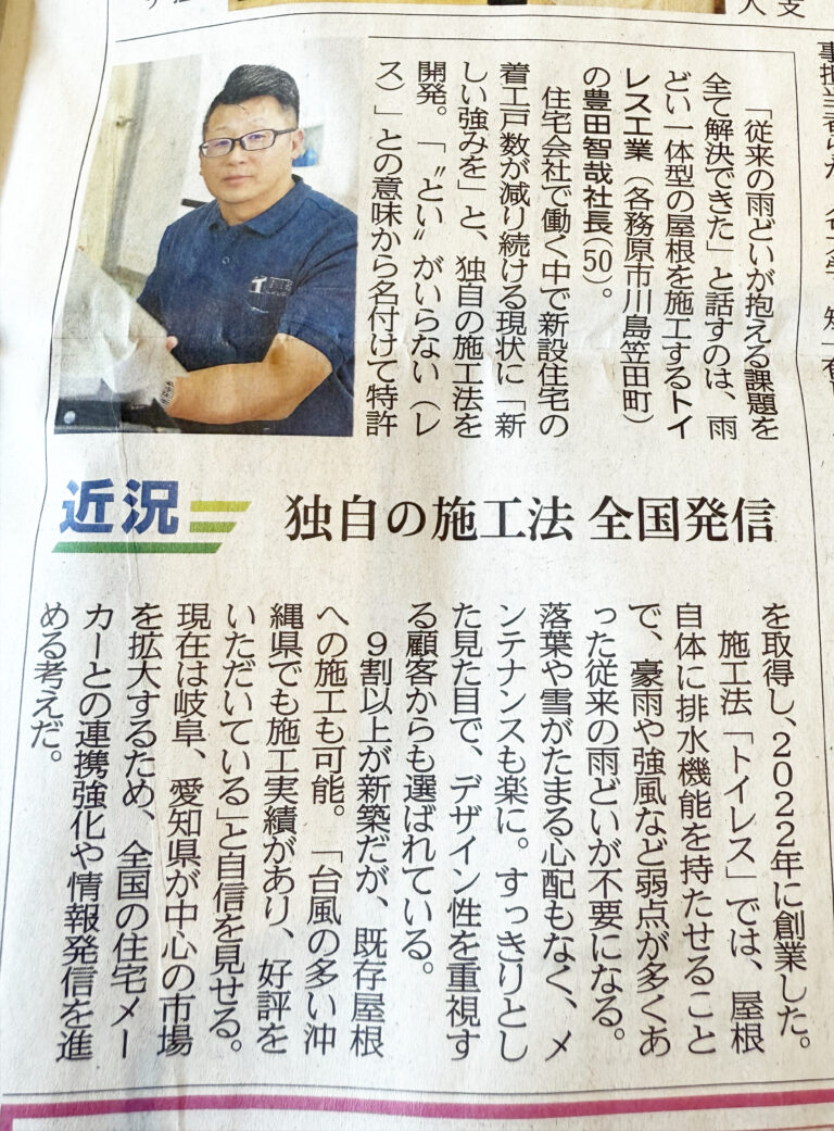 商工会の取材が新聞掲載されました この度、商工会による当社への取材記事が新聞に掲載されました。紙面では、屋根と雨どいを一体化させる独自の施工法「トイレス工法」についてご紹介いただい...