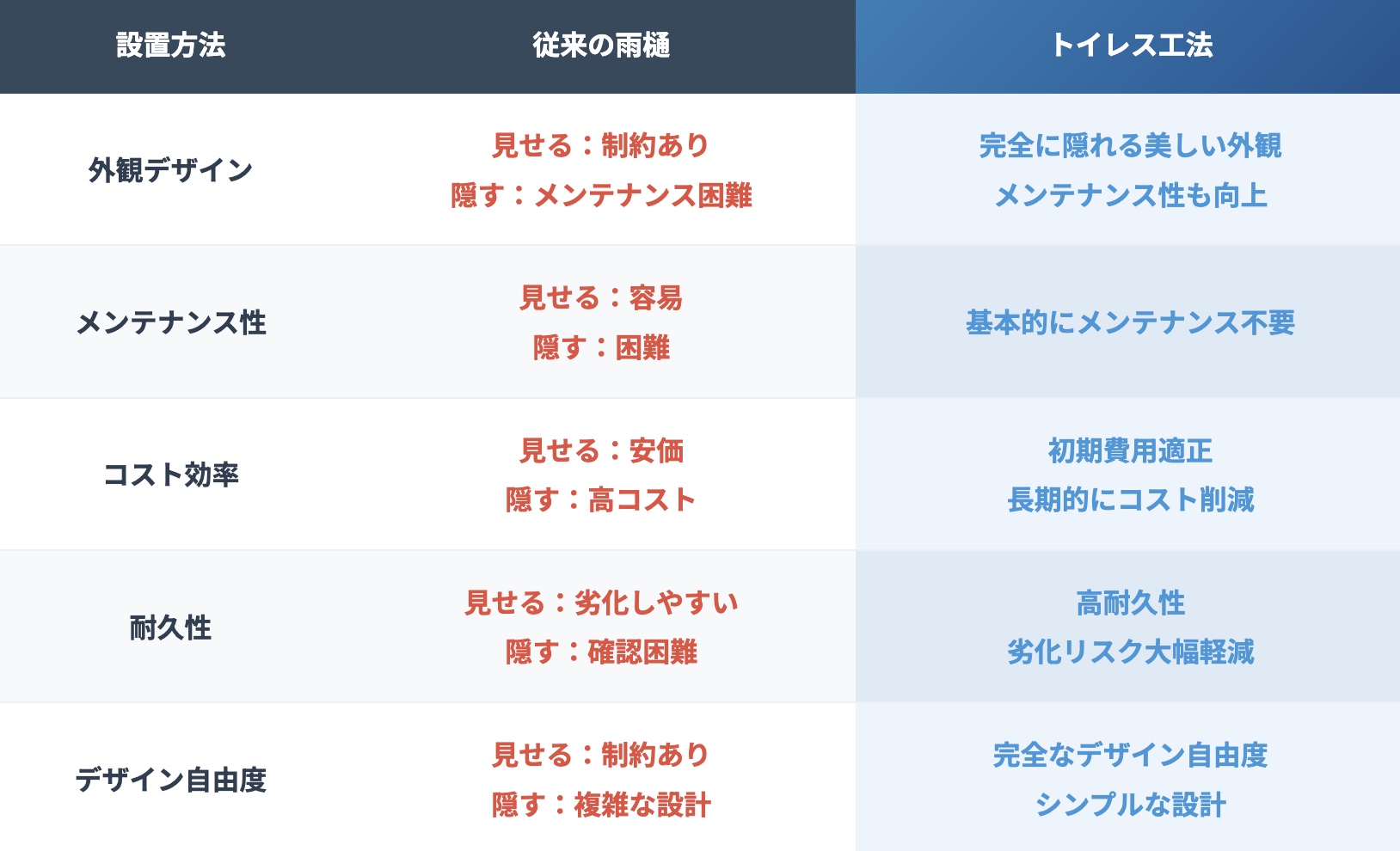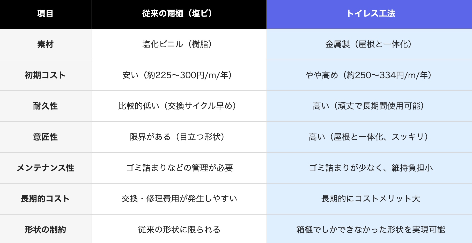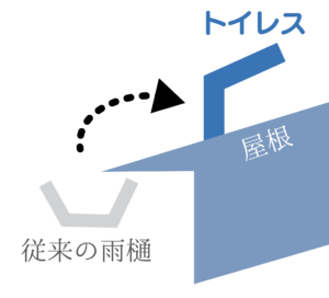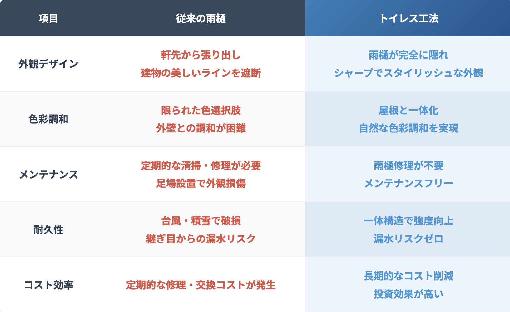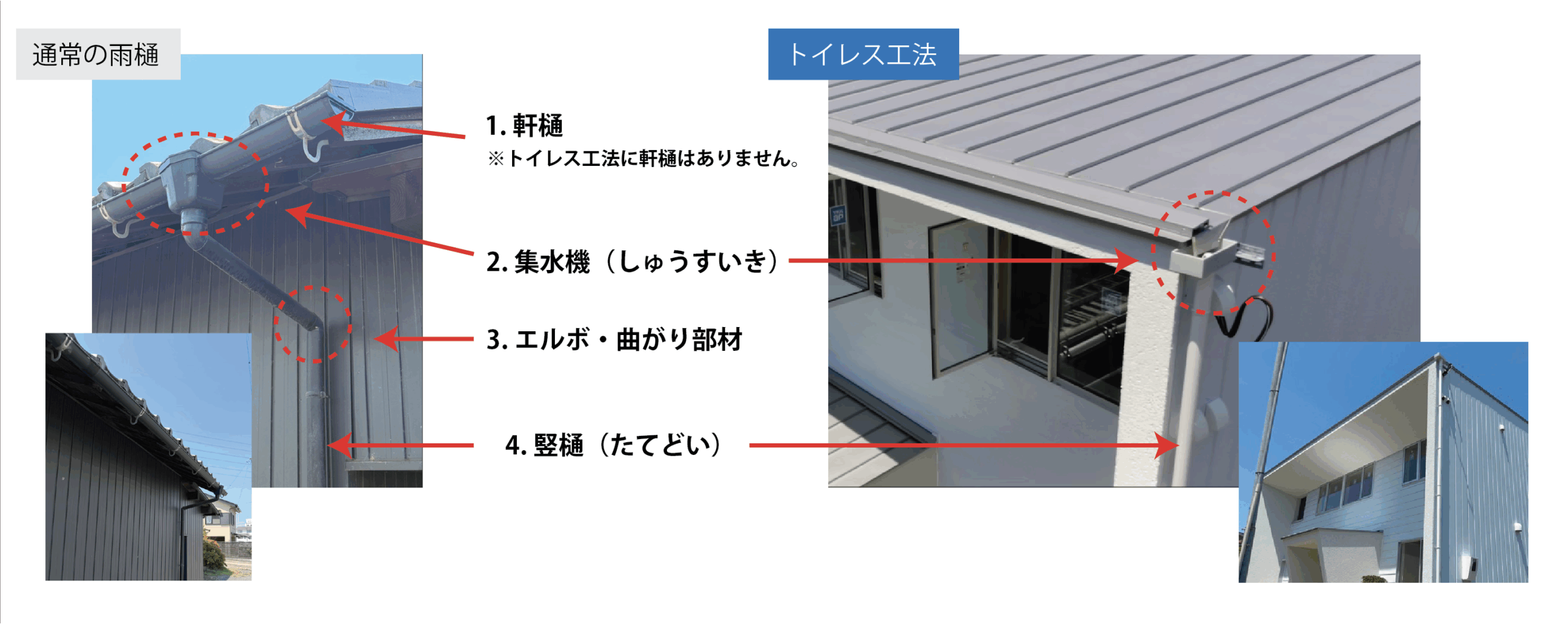 お役立ち情報 おしゃれな雨樋で家の外観は劇的に変わる!選び方・人気商品・施工事例・費用まで徹底解説 目次 ◉ はじめに ◎ 雨樋選びの考え方が変わってきた ❶ 雨樋は「機能だけ」じゃない時代に ❷ 従来の雨樋とトイレス工法、何が違うの? ◎ 雨樋の基本を知ろう ⚪︎ 雨樋はどんなパーツでできている? - 部材各所(全体像を図解) - 軒樋(のきどい) - 集水機(しゅうすいき) - エルボ・曲がり部材 - 竪樋(たてどい) ◎ 雨樋の種類と選び方 ❶ 素材で選ぶ:どれが長持ちする? - 塩化ビニル - ガルバニウム鋼板 - アルミ - 銅 - ステンレス - トイレス工法 ❷ 形状で選ぶ:角型?丸型?どっちがいいの? - 角型:スタイリッシュな印象 - 丸型:優しい印象 - 鎖樋:装飾的 - 箱樋(隠し樋):雨樋が見えない ❸ 色で選ぶ:家の色とどう合わせる? - 外壁や屋根の色に「馴染ませる」 - サッシの色と「合わせる」 - あえて「アクセント」として使う ◎ 失敗しない!雨樋選びの5つのポイント ❶ 家の外観デザインと合っているか ❷ 長持ちする素材か?メンテナンスは大変? ❸ 住んでいる地域の気候に合っているか ❹ 雨樋を見せる?隠す? ❺ 予算は?長期的なコストは? ◎ トイレス工法の施工事例集 ◎ 費用の目安を知ろう ❶ リフォームする場合、いくらかかる? ❷ 費用を抑えるコツ ◎ まとめ:おしゃれな雨樋でワンランク上の外観を手に入れよう ◆ はじめに:雨樋って何?なぜ大切なの? 雨樋(あまどい)は、屋根に降った雨水を集めて、建物の外壁や基礎を守るための大切な設備です。もし雨樋がなかったら、雨水が屋根から直接流れ落ちて、外壁が汚れたり、基礎が傷んだりしてしまいます。 雨樋選びは重要でたくさんの種類があります。素材も違えば、形も色も様々。そして、選ぶ雨樋によって値段、耐久性、外観、メンテナンス性が違います。 つまり、雨樋選びは「安いものを選べばいい」という単純な話ではないのです。上記に挙げた性能を総合的に考えることが大切です。 このブログでは、特に「トイレス工法」という特殊な工法についても詳しくご紹介します。 雨樋選びの考え方が変わってきた ❶ 雨樋は「機能だけ」じゃない時代に 住まいへの意識変化 ⚪︎ 以前の考え方「雨樋は雨水を流すためのもの。機能さえあればいい」 ◉ 今の考え方「雨樋も家のデザインの一部。おしゃれな見た目も大切にしたい」 最近、家づくりやリフォームに対する考え方が大きく変わってきました。昔は「雨樋は雨水を流せればいい」という考え方が一般的でしたが、今では「おしゃれな雨樋」も家の外観を左右する大切な要素」として考える人が増えています。 家の価値にも影響する雨樋選び 実は、「おしゃれな雨樋」選びは家の資産価値にも影響します。外観が美しい家は、売却時や評価時にも有利になることが多く、最初から良い雨樋を選ぶことで、将来的なメンテナンス費用を抑えながら、長い間おしゃれな見た目を保ち続けることができます。つまり、雨樋選びは「今だけ」ではなく、「10年後、20年後」を見据えた投資として考えることが大切なのです。 ❷ 従来の雨樋とトイレス工法、何が違うの? 雨樋を選ぶ時、まず知っておきたいのは「どんな種類があるのか」ということです。大きく分けると、「従来の雨樋」と「トイレス工法」という2つの選択肢があります。 ⚪︎ 従来の雨樋とは? 従来の雨樋は、主に塩化ビニル製のものが一般的でした。これは、屋根の下に別のパーツとして取り付けるタイプです。 ⚪︎トイレス工法とは? トイレス工法は、雨樋を屋根と一体化させる特殊な工法です。雨樋が見えないように設計されています。 🔍 表タップで拡大 どちらを選ぶべきか?次の章から詳しく見ていきましょう。 雨樋の基本を知ろう ⚪︎ 雨樋はどんなパーツでできている? 雨樋は、屋根に降った雨水を効率的に流すために、いくつかのパーツで構成されています。屋根工事を行う際には、これらのパーツの役割を理解しておくと、適切な雨樋の種類を選ぶことができます。 - 部材各所 🔍 画像タップで拡大 1. 軒樋 屋根の軒先に取り付けられ、雨水を受け止めて集めます。建物外壁への雨だれを防ぎ、基礎部分の浸食を防止する重要な部位です。 2. 集水機(しゅうすいき) 軒樋から流れる雨水を竪樋に導くためのパーツです。デザイン性のある集水器を使えば、外観のアクセントにもなります。 3. エルボ・曲がり部材 雨樋を建物の形状に合わせて取り付けるための部材です。特に複雑な屋根形状の場合には重要です。 4. 竪樋(たてどい) 軒樋で集めた雨水を地上または排水設備へ流す役割を担います。雨水を効率的に地面に流し、外壁の汚れや劣化を防ぎます。 雨樋の種類と選び方 ❶ 素材で選ぶ:どれが長持ちする? おしゃれな雨樋を選ぶ際には、素材の特徴を理解することが大切です。 塩化ビニル(樹脂製)雨樋 耐久性:△ 軽量で安価、ホームセンターでも購入しやすいDIYでの修理も比較的容易塩害地域では、夏の直射日光による高温(60℃以上)で膨張し、