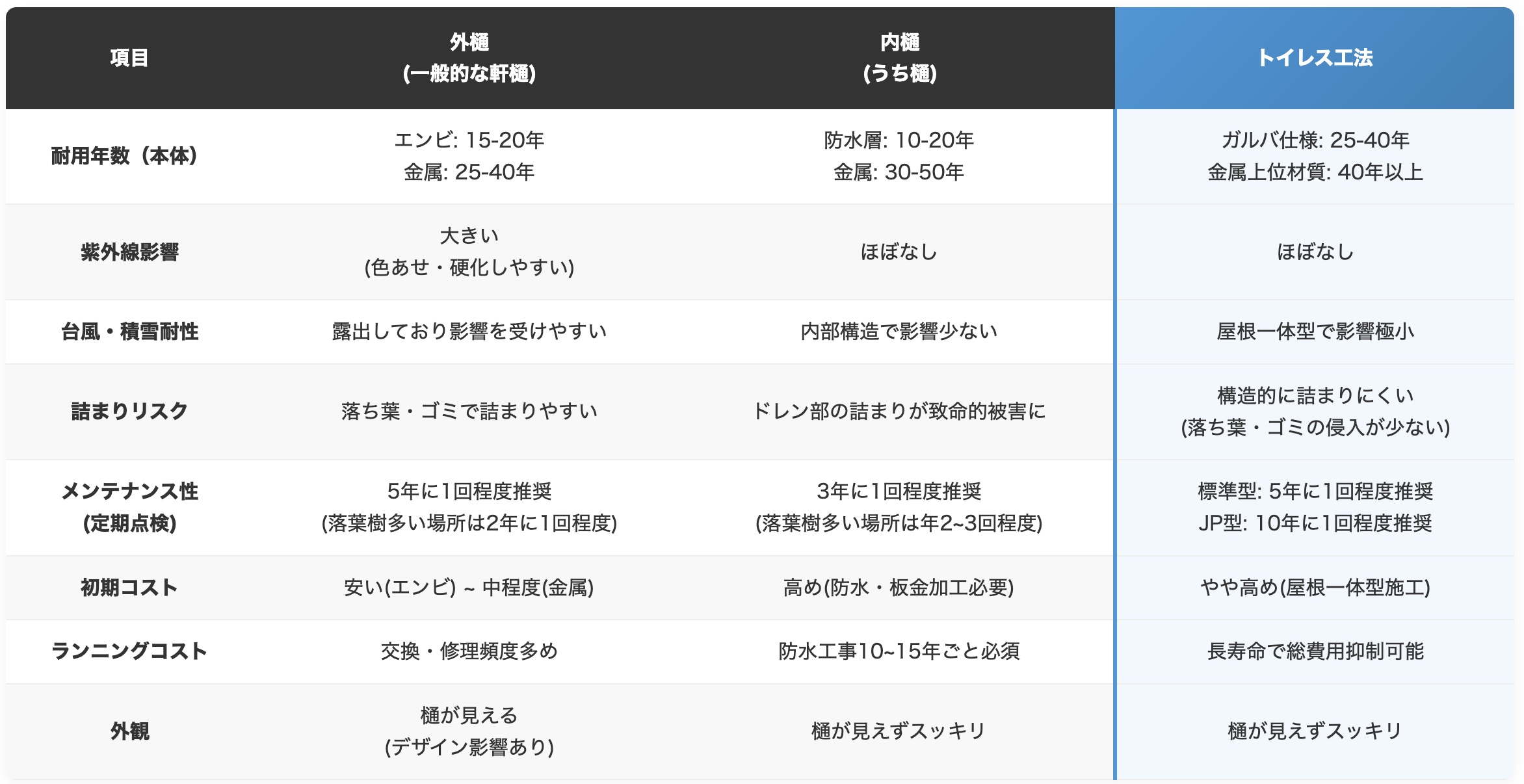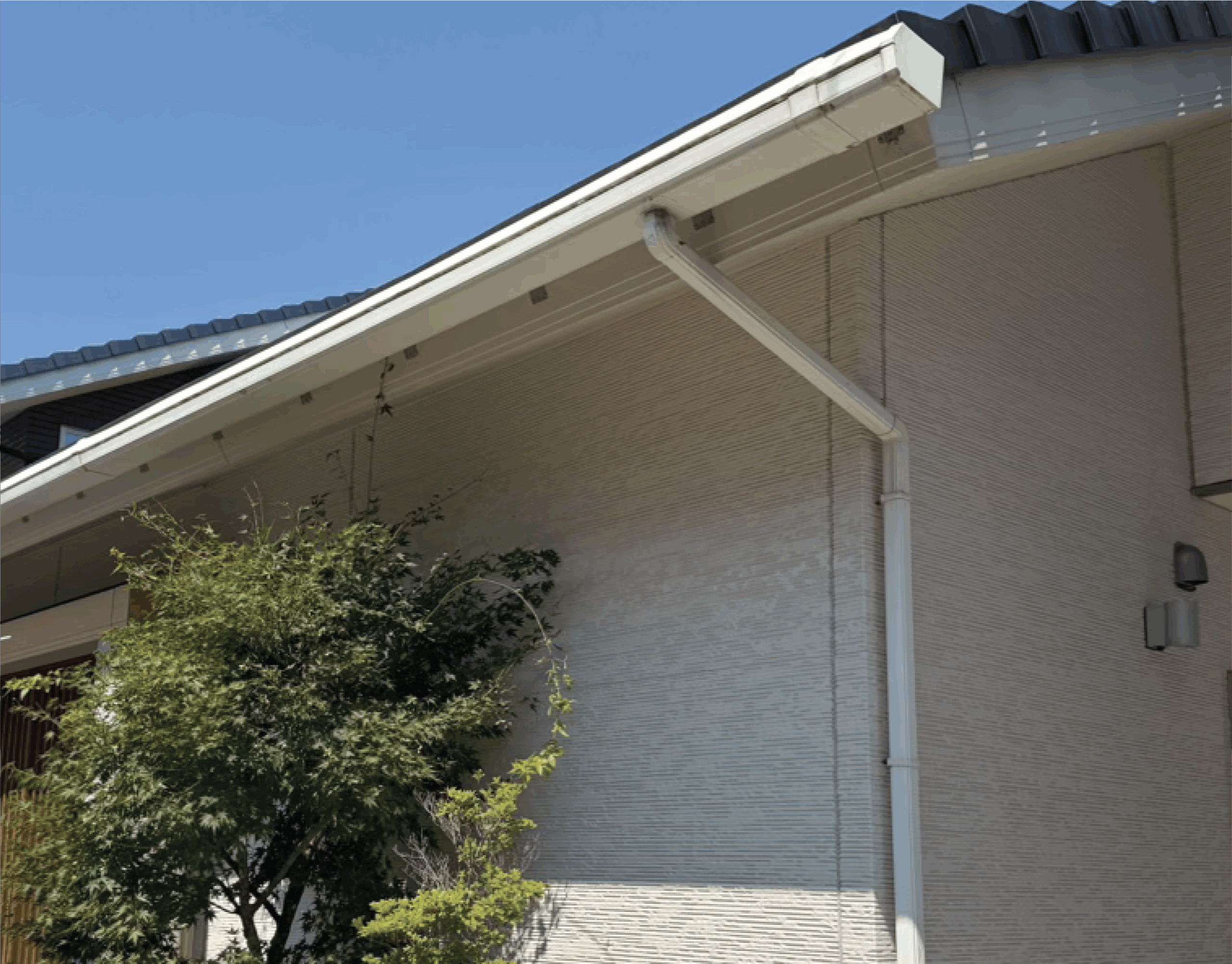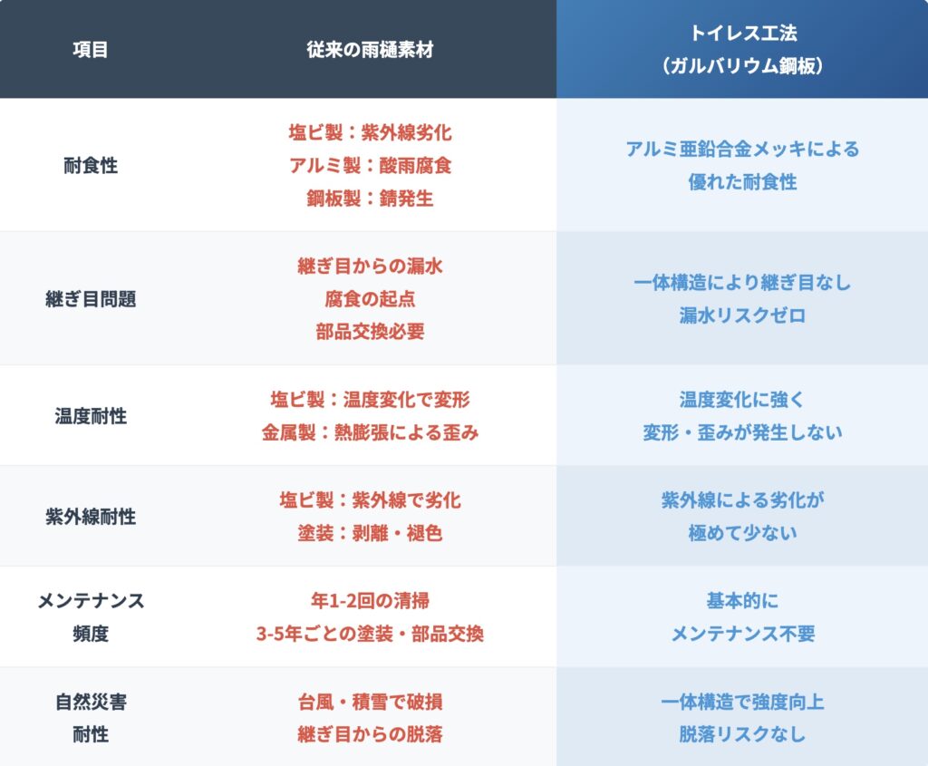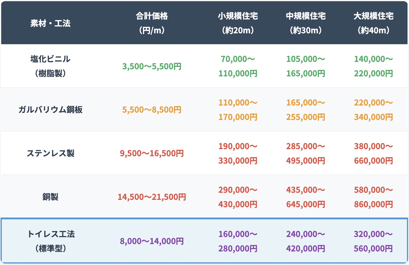 お役立ち情報 おしゃれな雨樋で家の外観は劇的に変わる!選び方・人気商品・施工事例・費用まで徹底解説 目次 ◉ はじめに ◎ 雨樋選びの考え方が変わってきた ❶ 雨樋は「機能だけ」じゃない時代に ❷ 従来の雨樋とトイレス工法、何が違うの? ◎ 雨樋の基本を知ろう ⚪︎ 雨樋はどんなパーツでできている? - 部材各所(全体像を図解) - 軒樋(のきどい) - 集水機(しゅうすいき) - エルボ・曲がり部材 - 竪樋(たてどい) ◎ 雨樋の種類と選び方 ❶ 素材で選ぶ:どれが長持ちする? - 塩化ビニル - ガルバニウム鋼板 - アルミ - 銅 - ステンレス - トイレス工法 ❷ 形状で選ぶ:角型?丸型?どっちがいいの? - 角型:スタイリッシュな印象 - 丸型:優しい印象 - 鎖樋:装飾的 - 箱樋(隠し樋):雨樋が見えない ❸ 色で選ぶ:家の色とどう合わせる? - 外壁や屋根の色に「馴染ませる」 - サッシの色と「合わせる」 - あえて「アクセント」として使う ◎ 失敗しない!雨樋選びの5つのポイント ❶ 家の外観デザインと合っているか ❷ 長持ちする素材か?メンテナンスは大変? ❸ 住んでいる地域の気候に合っているか ❹ 雨樋を見せる?隠す? ❺ 予算は?長期的なコストは? ◎ トイレス工法の施工事例集 ◎ 費用の目安を知ろう ❶ リフォームする場合、いくらかかる? ❷ 費用を抑えるコツ ◎ まとめ:おしゃれな雨樋でワンランク上の外観を手に入れよう ◆ はじめに:雨樋って何?なぜ大切なの? 雨樋(あまどい)は、屋根に降った雨水を集めて、建物の外壁や基礎を守るための大切な設備です。もし雨樋がなかったら、雨水が屋根から直接流れ落ちて、外壁が汚れたり、基礎が傷んだりしてしまいます。 雨樋選びは重要でたくさんの種類があります。素材も違えば、形も色も様々。そして、選ぶ雨樋によって値段、耐久性、外観、メンテナンス性が違います。 つまり、雨樋選びは「安いものを選べばいい」という単純な話ではないのです。上記に挙げた性能を総合的に考えることが大切です。 このブログでは、特に「トイレス工法」という特殊な工法についても詳しくご紹介します。 雨樋選びの考え方が変わってきた ❶ 雨樋は「機能だけ」じゃない時代に 住まいへの意識変化 ⚪︎ 以前の考え方「雨樋は雨水を流すためのもの。機能さえあればいい」 ◉ 今の考え方「雨樋も家のデザインの一部。おしゃれな見た目も大切にしたい」 最近、家づくりやリフォームに対する考え方が大きく変わってきました。昔は「雨樋は雨水を流せればいい」という考え方が一般的でしたが、今では「おしゃれな雨樋」も家の外観を左右する大切な要素」として考える人が増えています。 家の価値にも影響する雨樋選び 実は、「おしゃれな雨樋」選びは家の資産価値にも影響します。外観が美しい家は、売却時や評価時にも有利になることが多く、最初から良い雨樋を選ぶことで、将来的なメンテナンス費用を抑えながら、長い間おしゃれな見た目を保ち続けることができます。つまり、雨樋選びは「今だけ」ではなく、「10年後、20年後」を見据えた投資として考えることが大切なのです。 ❷ 従来の雨樋とトイレス工法、何が違うの? 雨樋を選ぶ時、まず知っておきたいのは「どんな種類があるのか」ということです。大きく分けると、「従来の雨樋」と「トイレス工法」という2つの選択肢があります。 ⚪︎ 従来の雨樋とは? 従来の雨樋は、主に塩化ビニル製のものが一般的でした。これは、屋根の下に別のパーツとして取り付けるタイプです。 ⚪︎トイレス工法とは? トイレス工法は、雨樋を屋根と一体化させる特殊な工法です。雨樋が見えないように設計されています。 🔍 表タップで拡大 どちらを選ぶべきか?次の章から詳しく見ていきましょう。 雨樋の基本を知ろう ⚪︎ 雨樋はどんなパーツでできている? 雨樋は、屋根に降った雨水を効率的に流すために、いくつかのパーツで構成されています。屋根工事を行う際には、これらのパーツの役割を理解しておくと、適切な雨樋の種類を選ぶことができます。 - 部材各所 🔍 画像タップで拡大 1. 軒樋 屋根の軒先に取り付けられ、雨水を受け止めて集めます。建物外壁への雨だれを防ぎ、基礎部分の浸食を防止する重要な部位です。 2. 集水機(しゅうすいき) 軒樋から流れる雨水を竪樋に導くためのパーツです。デザイン性のある集水器を使えば、外観のアクセントにもなります。 3. エルボ・曲がり部材 雨樋を建物の形状に合わせて取り付けるための部材です。特に複雑な屋根形状の場合には重要です。 4. 竪樋(たてどい) 軒樋で集めた雨水を地上または排水設備へ流す役割を担います。雨水を効率的に地面に流し、外壁の汚れや劣化を防ぎます。 雨樋の種類と選び方 ❶ 素材で選ぶ:どれが長持ちする? おしゃれな雨樋を選ぶ際には、素材の特徴を理解することが大切です。 塩化ビニル(樹脂製)雨樋 耐久性:△ 軽量で安価、ホームセンターでも購入しやすいDIYでの修理も比較的容易塩害地域では、夏の直射日光による高温(60℃以上)で膨張し、