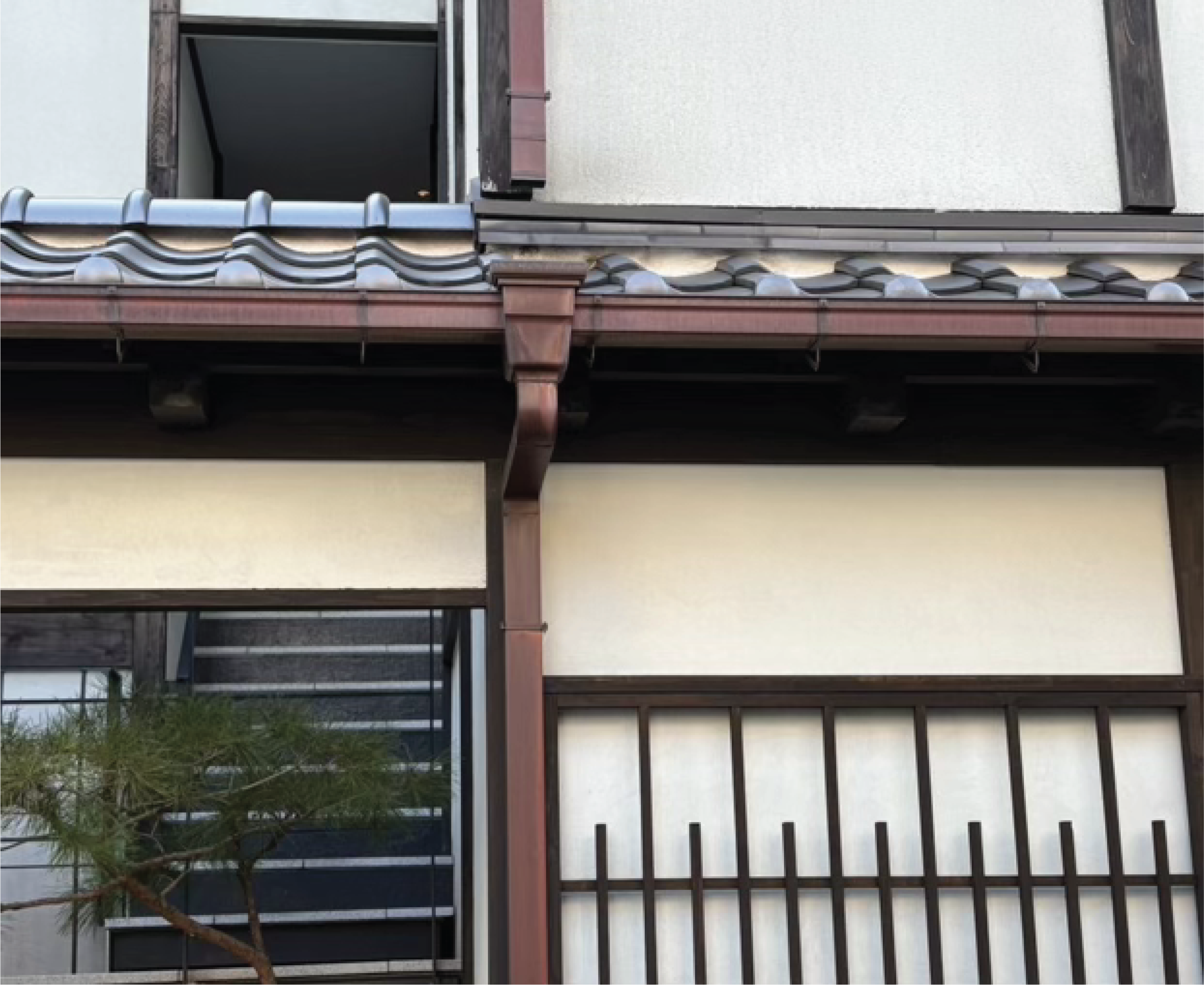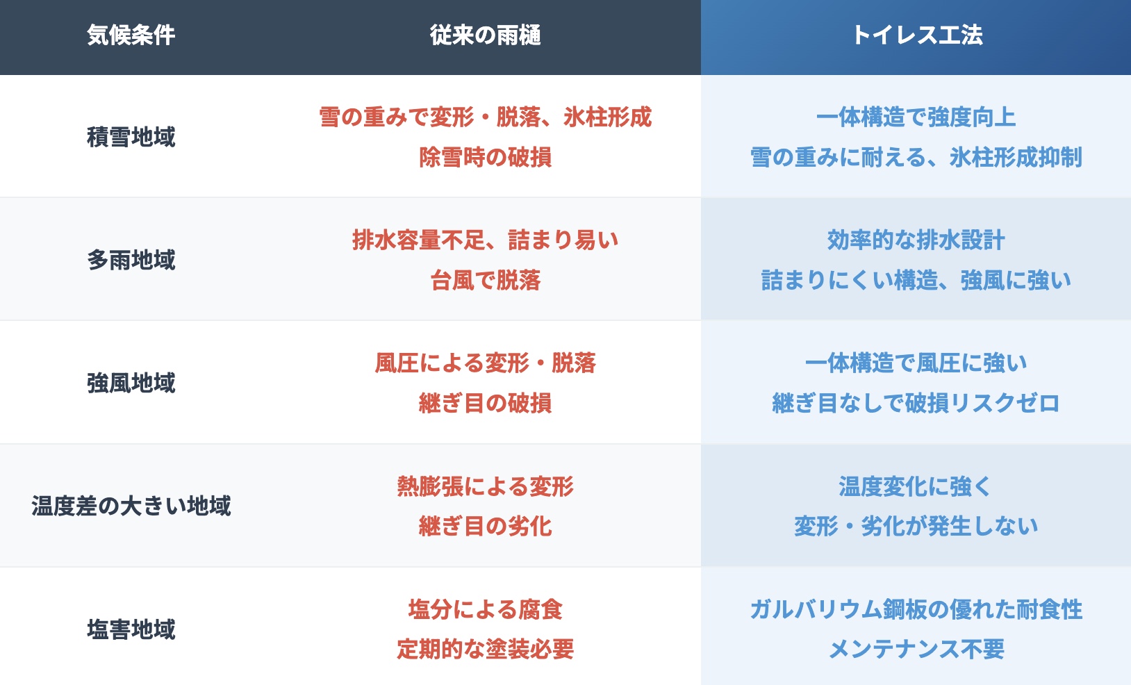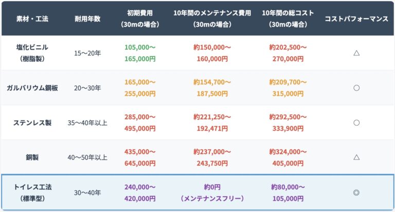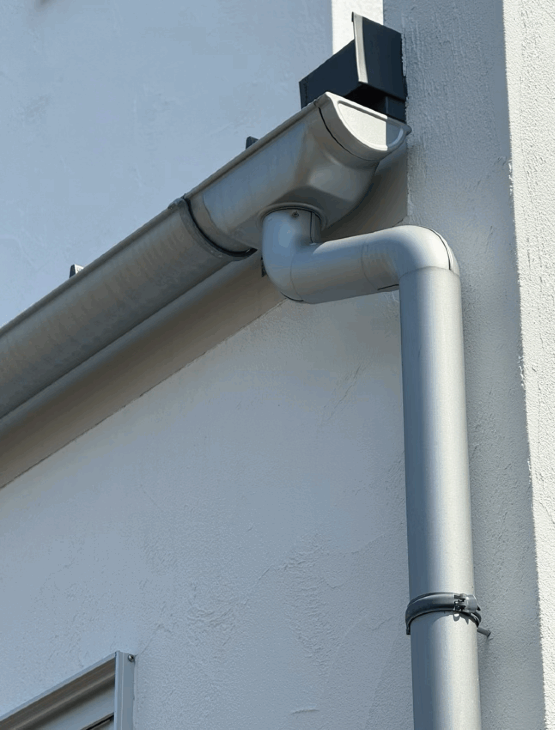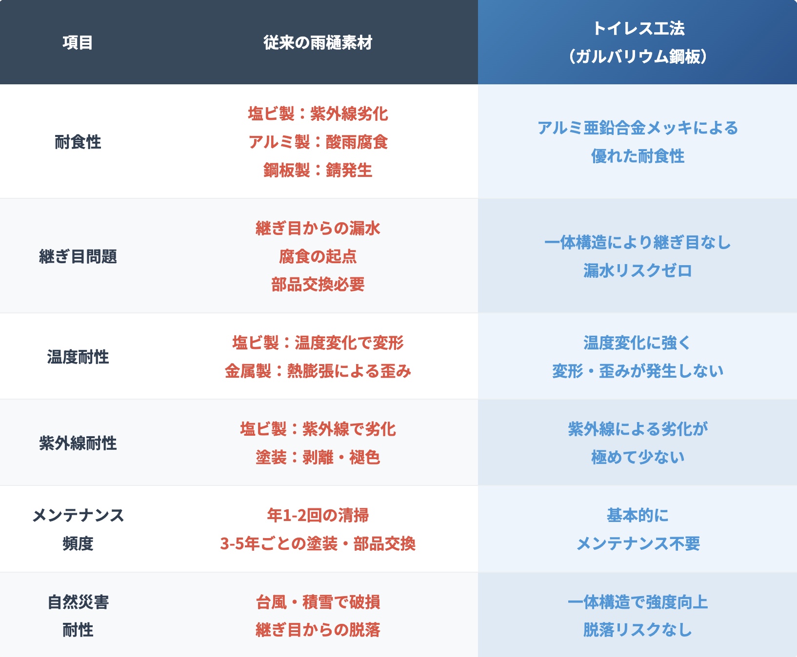 お役立ち情報 おしゃれな雨樋で家の外観は劇的に変わる!選び方・人気商品・施工事例・費用まで徹底解説 目次 ◉ はじめに ◎ 雨樋選びの考え方が変わってきた ❶ 雨樋は「機能だけ」じゃない時代に ❷ 従来の雨樋とトイレス工法、何が違うの? ◎ 雨樋の基本を知ろう ⚪︎ 雨樋はどんなパーツでできている? - 部材各所(全体像を図解) - 軒樋(のきどい) - 集水機(しゅうすいき) - エルボ・曲がり部材 - 竪樋(たてどい) ◎ 雨樋の種類と選び方 ❶ 素材で選ぶ:どれが長持ちする? - 塩化ビニル - ガルバニウム鋼板 - アルミ - 銅 - ステンレス - トイレス工法 ❷ 形状で選ぶ:角型?丸型?どっちがいいの? - 角型:スタイリッシュな印象 - 丸型:優しい印象 - 鎖樋:装飾的 - 箱樋(隠し樋):雨樋が見えない ❸ 色で選ぶ:家の色とどう合わせる? - 外壁や屋根の色に「馴染ませる」 - サッシの色と「合わせる」 - あえて「アクセント」として使う ◎ 失敗しない!雨樋選びの5つのポイント ❶ 家の外観デザインと合っているか ❷ 長持ちする素材か?メンテナンスは大変? ❸ 住んでいる地域の気候に合っているか ❹ 雨樋を見せる?隠す? ❺ 予算は?長期的なコストは? ◎ トイレス工法の施工事例集 ◎ 費用の目安を知ろう ❶ リフォームする場合、いくらかかる? ❷ 費用を抑えるコツ ◎ まとめ:おしゃれな雨樋でワンランク上の外観を手に入れよう ◆ はじめに:雨樋って何?なぜ大切なの? 雨樋(あまどい)は、屋根に降った雨水を集めて、建物の外壁や基礎を守るための大切な設備です。もし雨樋がなかったら、雨水が屋根から直接流れ落ちて、外壁が汚れたり、基礎が傷んだりしてしまいます。 雨樋選びは重要でたくさんの種類があります。素材も違えば、形も色も様々。そして、選ぶ雨樋によって値段、耐久性、外観、メンテナンス性が違います。 つまり、雨樋選びは「安いものを選べばいい」という単純な話ではないのです。上記に挙げた性能を総合的に考えることが大切です。 このブログでは、特に「トイレス工法」という特殊な工法についても詳しくご紹介します。 雨樋選びの考え方が変わってきた ❶ 雨樋は「機能だけ」じゃない時代に 住まいへの意識変化 ⚪︎ 以前の考え方「雨樋は雨水を流すためのもの。機能さえあればいい」 ◉ 今の考え方「雨樋も家のデザインの一部。おしゃれな見た目も大切にしたい」 最近、家づくりやリフォームに対する考え方が大きく変わってきました。昔は「雨樋は雨水を流せればいい」という考え方が一般的でしたが、今では「おしゃれな雨樋」も家の外観を左右する大切な要素」として考える人が増えています。 家の価値にも影響する雨樋選び 実は、「おしゃれな雨樋」選びは家の資産価値にも影響します。外観が美しい家は、売却時や評価時にも有利になることが多く、最初から良い雨樋を選ぶことで、将来的なメンテナンス費用を抑えながら、長い間おしゃれな見た目を保ち続けることができます。つまり、雨樋選びは「今だけ」ではなく、「10年後、20年後」を見据えた投資として考えることが大切なのです。 ❷ 従来の雨樋とトイレス工法、何が違うの? 雨樋を選ぶ時、まず知っておきたいのは「どんな種類があるのか」ということです。大きく分けると、「従来の雨樋」と「トイレス工法」という2つの選択肢があります。 ⚪︎ 従来の雨樋とは? 従来の雨樋は、主に塩化ビニル製のものが一般的でした。これは、屋根の下に別のパーツとして取り付けるタイプです。 ⚪︎トイレス工法とは? トイレス工法は、雨樋を屋根と一体化させる特殊な工法です。雨樋が見えないように設計されています。 🔍 表タップで拡大 どちらを選ぶべきか?次の章から詳しく見ていきましょう。 雨樋の基本を知ろう ⚪︎ 雨樋はどんなパーツでできている? 雨樋は、屋根に降った雨水を効率的に流すために、いくつかのパーツで構成されています。屋根工事を行う際には、これらのパーツの役割を理解しておくと、適切な雨樋の種類を選ぶことができます。 - 部材各所 🔍 画像タップで拡大 1. 軒樋 屋根の軒先に取り付けられ、雨水を受け止めて集めます。建物外壁への雨だれを防ぎ、基礎部分の浸食を防止する重要な部位です。 2. 集水機(しゅうすいき) 軒樋から流れる雨水を竪樋に導くためのパーツです。デザイン性のある集水器を使えば、外観のアクセントにもなります。 3. エルボ・曲がり部材 雨樋を建物の形状に合わせて取り付けるための部材です。特に複雑な屋根形状の場合には重要です。 4. 竪樋(たてどい) 軒樋で集めた雨水を地上または排水設備へ流す役割を担います。雨水を効率的に地面に流し、外壁の汚れや劣化を防ぎます。 雨樋の種類と選び方 ❶ 素材で選ぶ:どれが長持ちする? おしゃれな雨樋を選ぶ際には、素材の特徴を理解することが大切です。 塩化ビニル(樹脂製)雨樋 耐久性:△ 軽量で安価、ホームセンターでも購入しやすいDIYでの修理も比較的容易塩害地域では、夏の直射日光による高温(60℃以上)で膨張し、